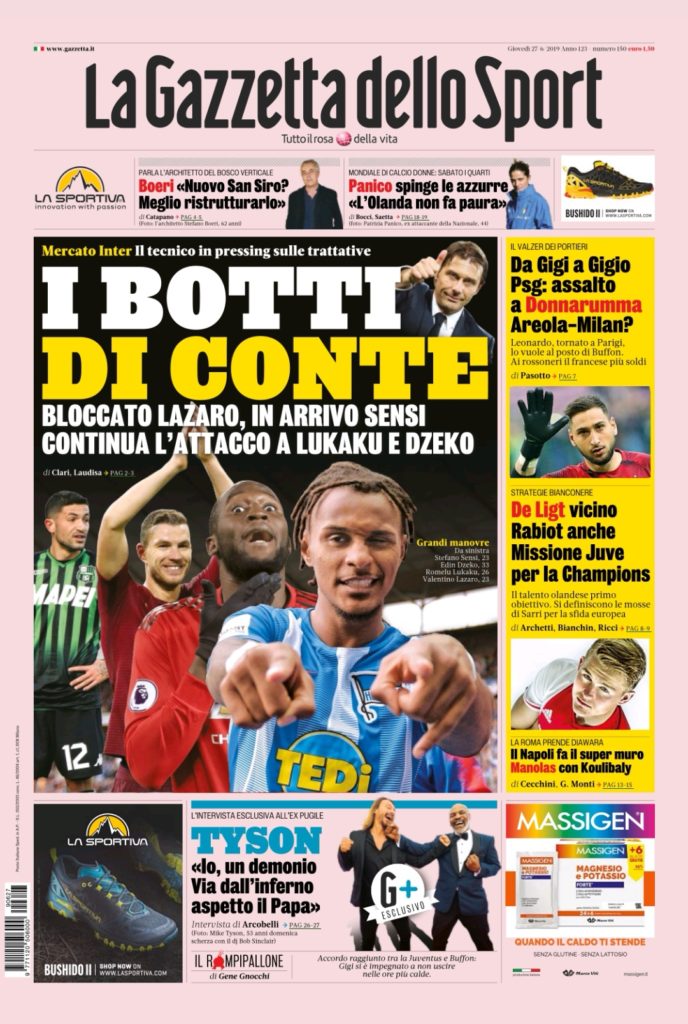 Queste le prime pagine dei principali quotidiani sportivi in edicola oggi, GiovedƬ 27 Giugno