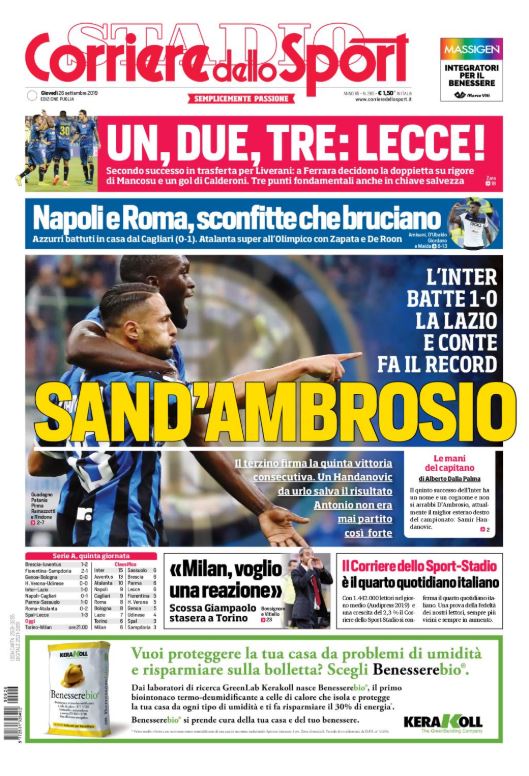 Queste le prime pagine dei quotidiani sportivi in edicola oggi, giovedƬ 26 settembre 2019