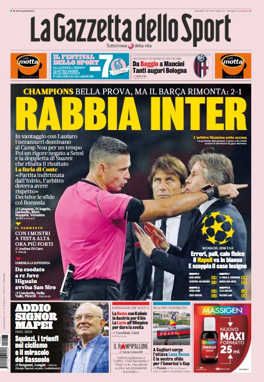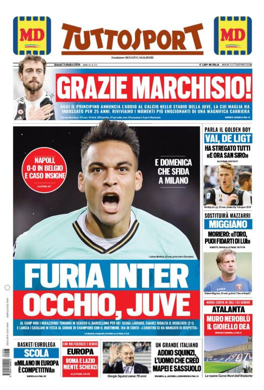 Queste le prime pagine dei quotidiani sportivi di oggi, giovedì 3 ottobre 2019