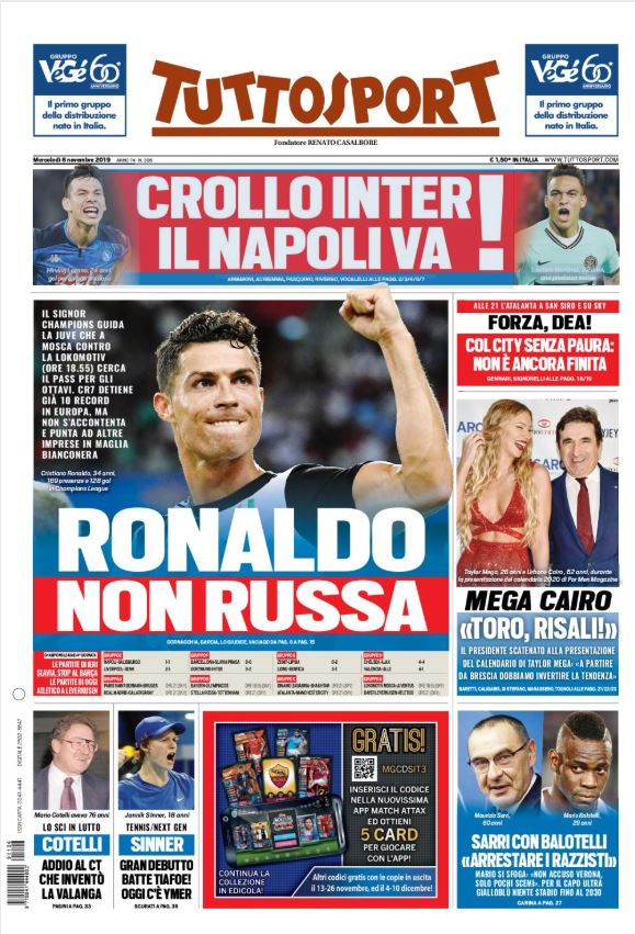 Queste le prime pagine dei quotidiani sportivi di oggi, mercoledì 6 novembre 2019