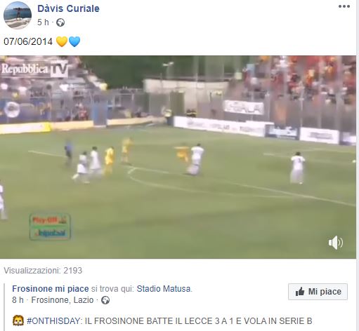 A ricordarlo ci ha invece pensato uno dei protagonisti di sponda gialloblu: l’attaccante Davis Curiale. Nonostante una stagione non certo idilliaca anche in maglia Lecce due anni più tardi, l’attuale punta del Catania non ha potuto non rivolgere un pensiero a quel pomeriggio di festa nella città laziale. E lo ha fatto postando su Facebook gli highlights di un match che, per i salentini, è solo una macchia in una storia di gioie passate e recenti.
