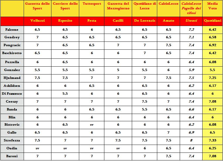 Ecco la comparazione tra le pagelle del Lecce scritte dalla nostra redazione e i quotidiani sportivi/locali. Strefezza, Hjulmand e Ceesay brillano su tutti. Sfortunato Gonzalez.