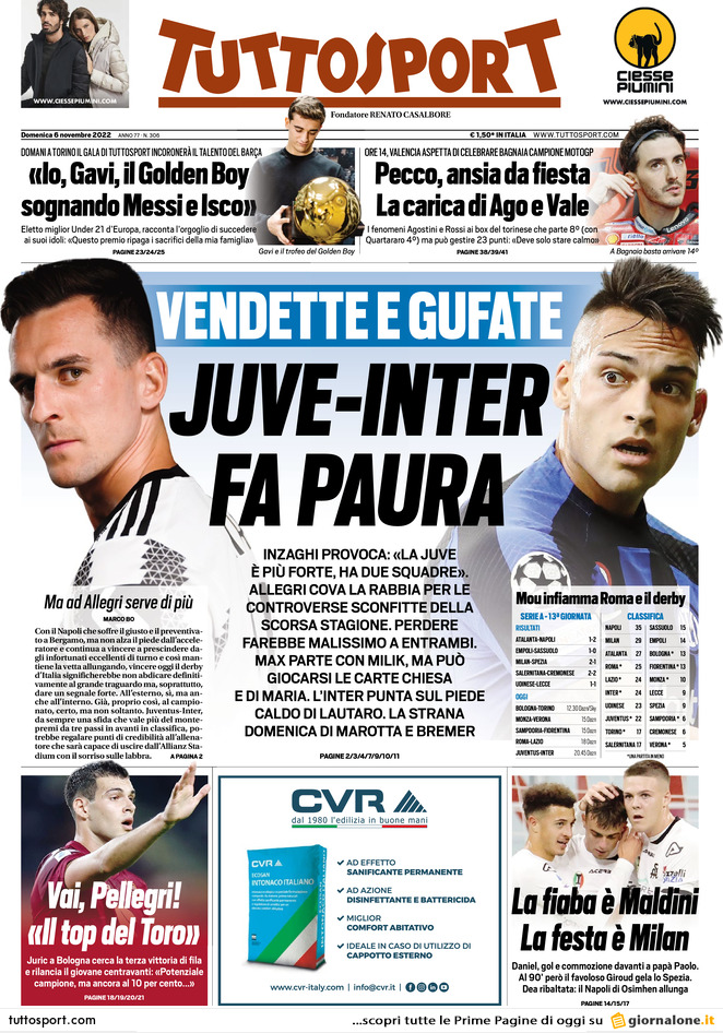 Il nostro consueto buongiorno con la rassegna stampa delle principali prime pagine dei quotidiani sportivi di domenica 6 novembre.