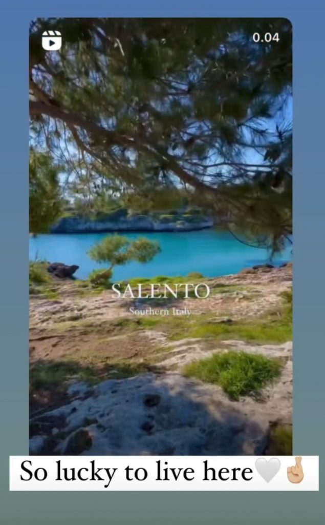 Ieri ha usato il proprio profilo Instagram per pubblicare una story in cui venivano riassunti alcuni degli scorci più belli del Salento, da Porto Badisco (come da fotogramma sottostante) a Sant’Andrea. Con tanto di eloquente “Fortunati a vivere qui”.