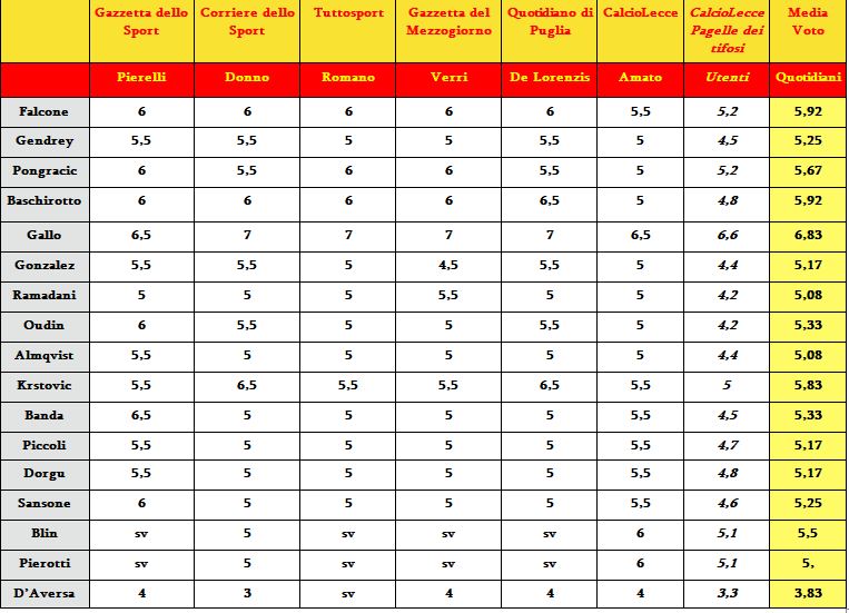 Ecco la comparazione tra le pagelle del Lecce scritte dalla nostra redazione e i quotidiani sportivi/locali. Solo Gallo va sopra la sufficienza. Almqvist e Ramadani i peggiori.