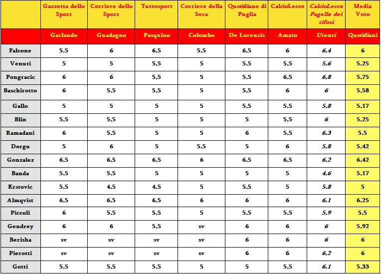 Ecco la comparazione tra le pagelle del Lecce scritte dalla nostra redazione e i quotidiani sportivi/locali. Gonzalez il migliore, anche Almqvist e Falcone si salvano. Krstovic, rosso che pesa.