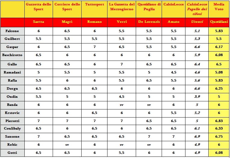 Ecco la comparazione tra le pagelle del Lecce scritte dalla nostra redazione e i quotidiani sportivi/locali. Pierotti top, poi Sansone e Gallo. Male Oudin.