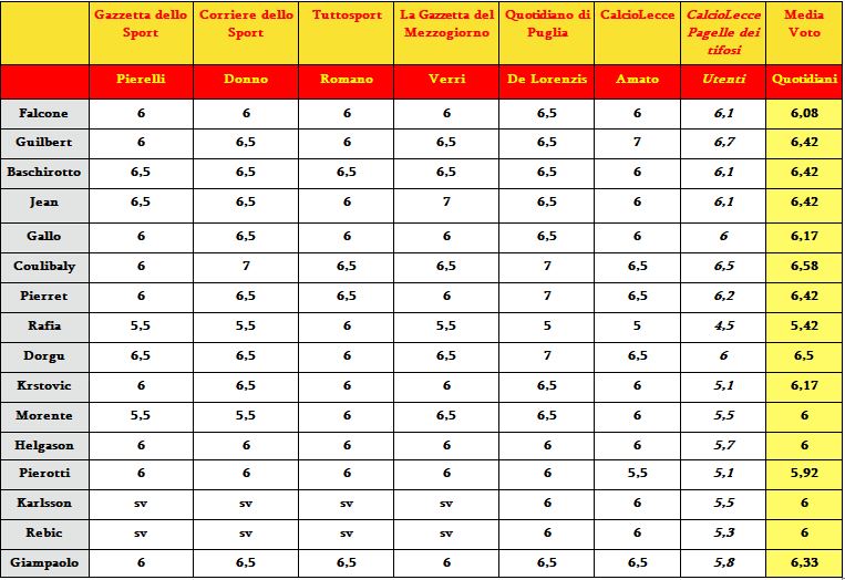 Ecco la comparazione tra le pagelle delĀ LecceĀ scritte dalla nostra redazioneĀ e i quotidiani sportivi/locali. Coulibaly ancora il migliore, poi Dorgu ed un gruppetto. Rafia nuovamente il peggiore.