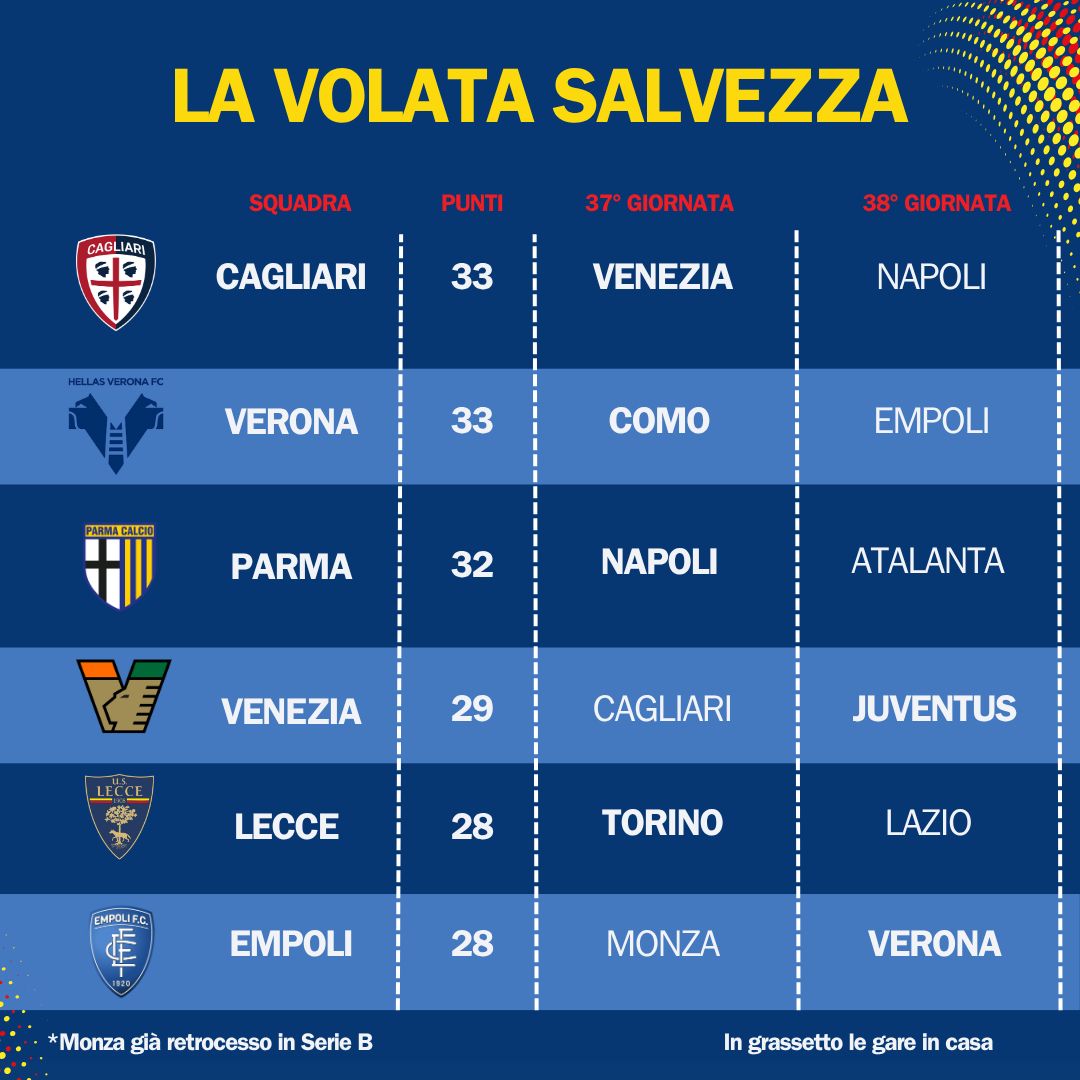 Tra Venezia e Cagliari ci sono poi anche Parma e Verona. I ducali, a +4 sul Lecce, hanno un calendario difficile con il Napoli capolista in casa e poi l’Atalanta in trasferta, sebbene gli orobici siano già certi del terzo posto. Per gli scaligeri sarà importante fare punti nella trasferta di Como, squadra più in forma d’Europa. Se così non fosse, occhio allo scontro diretto dell’ultima giornata con il Torino.