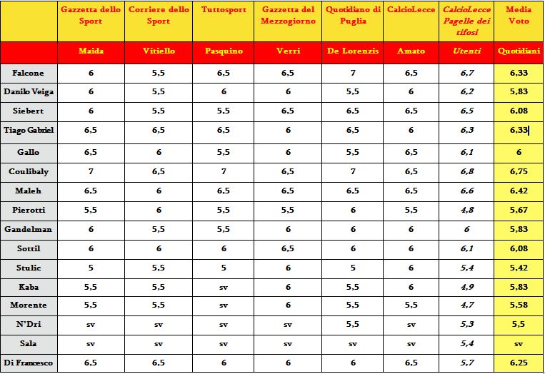 Ecco la comparazione tra le pagelle del Lecce scritte dalla nostra redazione e i quotidiani sportivi/locali. Coulibaly, Maleh, Falcone e Tiago i migliori. Stulic in difficoltà.