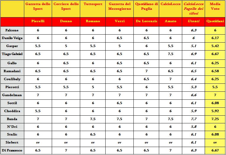 Ecco la comparazione tra le pagelle del Lecce scritte dalla nostra redazione e i quotidiani sportivi/locali. Ramadani top seguito da Coulibaly e Siebert. Stulic il peggiore.